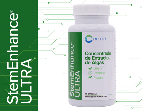 StemEnhance ULTRA, un extracto de AFA patentado y clínicamente probado, está asociado con Fucoidan de Undaria pinnatifida y Mesenkine, un concentrado exclusivo de Espirulina patentado por Cerule. Estos 3 ingredientes actúan en sinergia para promover la liberación de células madre adultas.