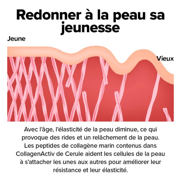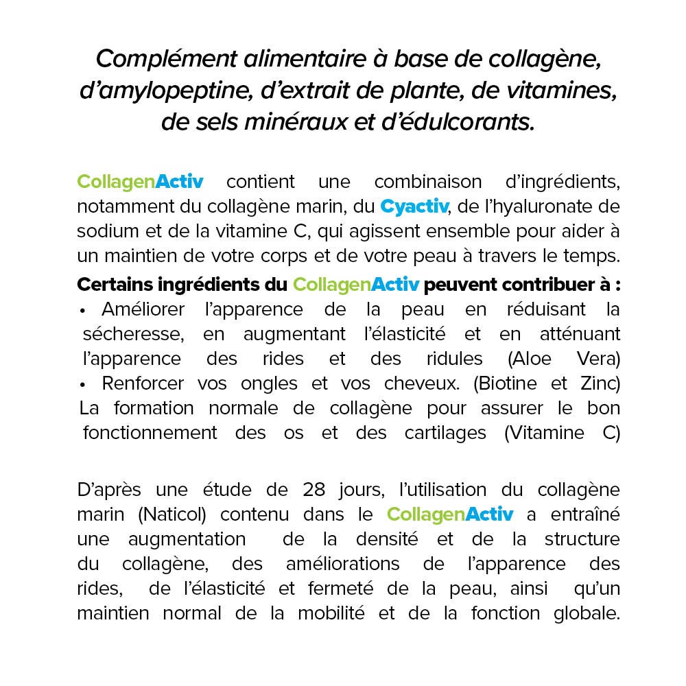 Le CollagenActiv marin, le Cyactiv, l'hyaluronate de sodium et la vitamine C contenus dans CollagenActiv agissent en synergie pour aider à améliorer les signes internes et externes du vieillissement.